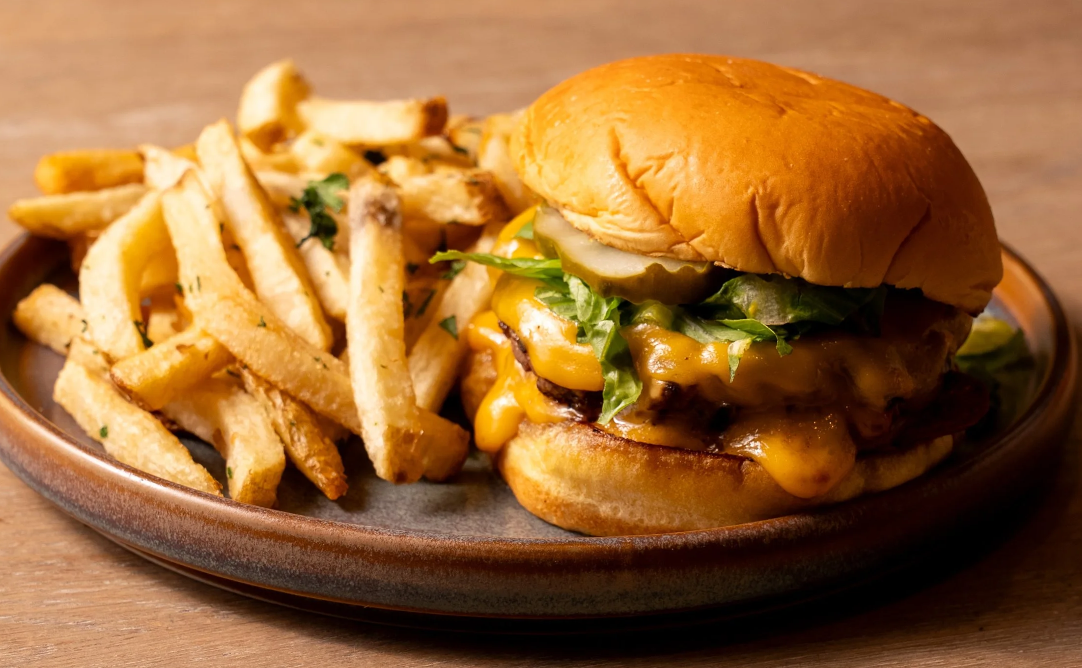two patties, american cheese, grilled onions, lettuce, pickle chips, secret sauce, mustard, potato bun, french fries